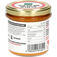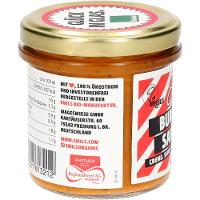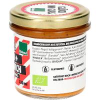 Rapsöl kaltgepresst*, Wasser, Aceto Balsamico di ModenaIGP* (konzentrierter Traubenmost*, Weinessig*), sonnengetrockneteTomaten* (Tomaten*, Salz, Apfelessig*), Apfelsaftkonzentrat*,MANDELN*, Weißweinessig*, geräucherte Paprika* (Paprika*,Buchenholzrauch), SENFSAAT*, Thymian*, Cayennepfeffer*.| Energie | Fett | gesättigte Fettsäuren | Kohlenhydrate | Zucker | Eiweiss | Salz |